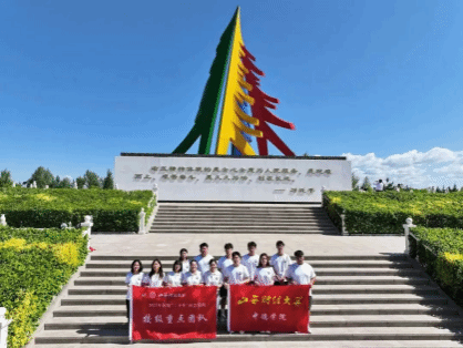 随后,同学们来到了南山森林公园。听着讲解员讲述右玉人民过去的艰苦奋斗,穿梭在林海之间,实践队员们来到了南山森林公园绿化丰碑。整座雕塑高20米,由主雕塑与基座构成。主雕塑,由红、黄、蓝、绿四棵颜色不同的参天大树组成,代表着特色分明的春夏秋冬。西侧浮雕描述的是最美奋斗者。在解放初期,右玉人民迎难而上、不畏艰险建设自己的美好家园。东侧浮雕是党的光辉照万代,描述的是在党的领导下,一代又一代右玉的县委书记们带领着右玉人民秉持着“不忘初心、牢记使命”的精神,把贫瘠的右玉大地变成生态发展摇篮。站在丰碑下,实践队员们切身感受到了习近平总书记对右玉精神作出的重要批示“全心全意为人民服务,迎难而上、艰苦奋斗,久久为功、利在长远”的内涵真谛,全体党员满怀崇敬的心情,共同重温入党誓词。