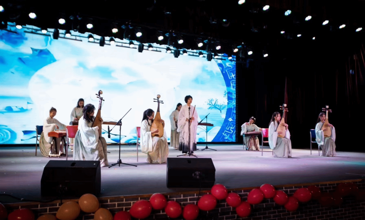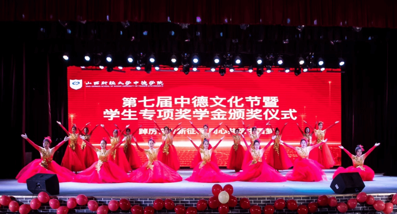 活动在开场舞《盛世欢歌》轻盈灵动、热烈奔放的舞姿中正式拉开序幕。“梦想启航”、“青春律动”、“奋斗不息”三大篇章以歌曲、舞蹈、小品、朗诵、器乐等丰富的形式展现中德文化交流互鉴,体现中德学子自信自强、与时俱进的精神风貌。演出伊始,一首《阳光男孩》器乐演奏振奋人心;民舞《碇步桥》如天上一轮春月,水袖如轻云般慢移,旋风般疾转,舞出了中华民族传统文化的无限魅力;德方教授带来的歌曲《雪融花》和中德文诗朗诵《朋友》、《情谊》,“相知无远近,万里尚为邻,愿我们的友谊天长地久”,“中国有月饼、德国有饼干;中国与德国携手并进,文化盛宴我们共同品味”,不仅为中德文化交流架起了友谊的桥梁,也让大家在诗歌的韵味中感受到中德文化交流互鉴、生生不息。一曲合唱《星辰大海》,荧光棒挥舞、欢呼声雷动。“梦想启航”篇章,展现了中德学子怀揣着坚定的信念和对梦想的执着追求。一个个红色的小精灵在舞台上翩翩起舞,《红灯笼》开启了我们的第二个“青春律动”篇章。小品《谁杀死了周日》赢得满堂喝彩,当我们还在回味精彩之时,歌曲《如愿》和爵士舞《rumor》又带给我们的别样的激情与青春的勃勃生机。“青春律动”篇章,生动诠释了中德学子亮丽的青春风采、迸发出豪迈的青春激情。百年征程波澜壮阔,百年初心历久弥坚。诗朗诵《祖国,一首唱不完的恋歌》带我们回顾了祖国风光秀美、地大物博,表达了对祖国的热爱与敬意。沉醉在诗朗诵抑扬顿挫昂扬真挚的情感时,古典乐器弹唱《青花瓷》指尖行云流水,明快的节奏,扬长的声音久久回荡在会场中。《彩虹》欢唱再次将晚会推向高潮,“奋斗不息”第三篇章,展现了中德学子与时代奋斗,与境遇奋斗,踔厉奋发,笃行不怠。最后,全体演职人员和工作人员倾情演唱《天下相亲与相爱》,在欢快和不舍的旋律中,第七届中德文化节暨学生专项奖学金颁奖仪式圆满落下了帷幕。