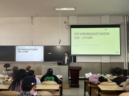 海蒂诗市场部门总经理孙腾飞先生,结合自身的留学经历,向大家展示了如何做自己的职业规划。他强调了,实习是每位同学重要的求职经历,如果想成为一名优秀的工作者,必须有卓越的实习经历。他同时也讲述了许多优秀工作者必备的工作能力,比如强大的自信,良好的沟通能力,解决问题的能力,跨国际的能力,他更强调了语言基础是非常重要的,包括德语,英语甚至于母语都是在工作中是非常重要的。他通过PPT的形式为同学们制定了一些职业规划的目标,并且帮助同学们找到自己就业的渠道和适合的专业。他也为同学们制作了了一些工作的小技巧,并且讲述了一些中国和德国的文化差异,帮助同学们在未来更好的适应工作环境,提高工作效率。最后,同学们踊跃地提问,尤其对于留德读研以及留德工作进行了具体提问,两名主要报告人也根据大家的提问做出了详细且具体的回答,现场气氛活泼且热烈。王院长也希望大家尽早做出就业规划,丰富自己的履历,扎实自己的学识,勇于奋进,积极进取,在未来成长和发展的道路上拥有良好的就业机会。