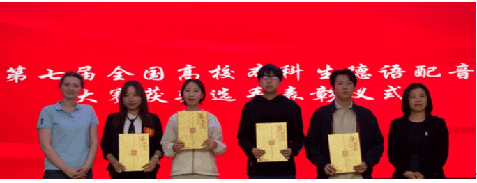 在第七届全国高校本科生德语配音大赛中获奖的同学颁发了荣誉证书,2023级李厚德、王喆以及2024级盛笑宇、苗璇、郝昀芃、刘译泽等同学上台领奖。