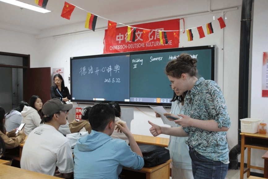 5月22日晚,同学们齐聚博学楼727教室,按出生日期分为“春夏秋冬”四支队伍,在德国知识问答、你画我猜、词语接龙中展开角逐。德方教师担任裁判,用德语实时点评互动,积分制竞赛让团队协作与语言应用同步提升,最终“春”组以最高分斩获优胜,现场掌声不断。