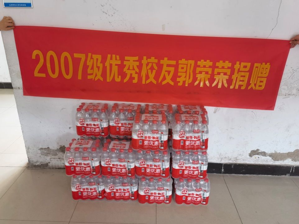 2007级优秀校友郭荣荣为母校捐赠了300瓶矿泉水、2011级优秀校友田晋安为母校捐赠了3000个医用口罩、300瓶免洗手消毒凝胶,为来自四面八方的中德2022级学子提供了爱心资助。
