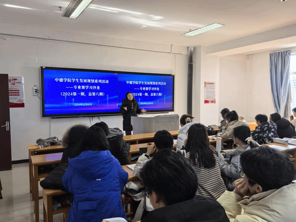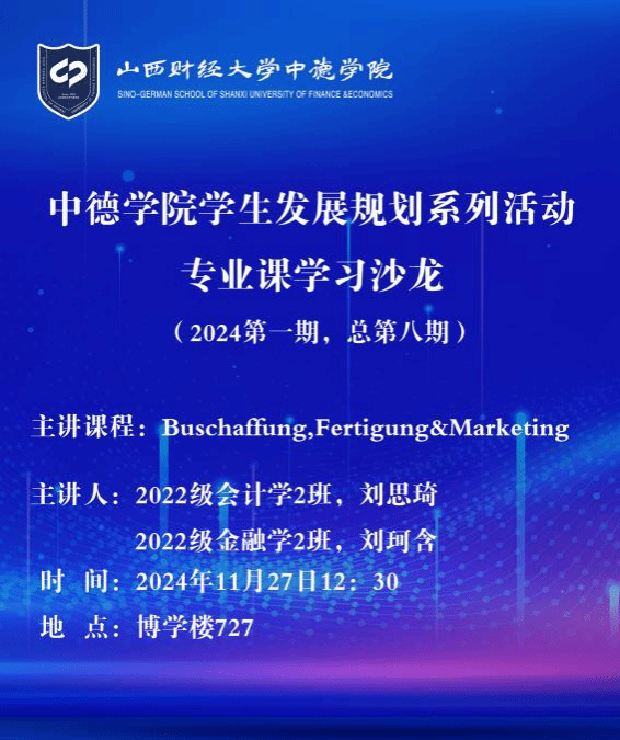 2024年第一期专业课程沙龙在博学楼727教室成功举办。本次专业课程沙龙主讲人为2022级会计学2班刘思琦、金融学2班刘珂含同学,她们针对《Buschaffung,Fertigung &Marketing》课程特点,对课程内容进行了梳理,将课程重点难点进行了讲授,将总结的学习方法进行了分享。2023级80多名同学参加了本次沙龙。