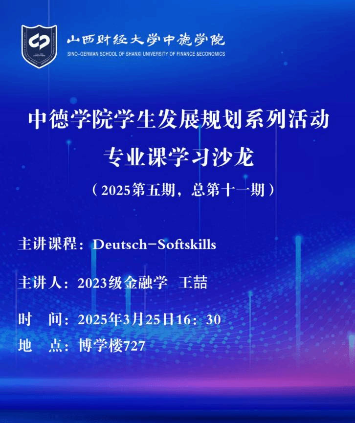 本次内容就《Deutsch-Softskills》课程特点及考试难点进行针对性梳理讲授,并将学习方法经验进行了分享。本次专业课程学习沙龙主讲人是2023级金融学王喆同学。