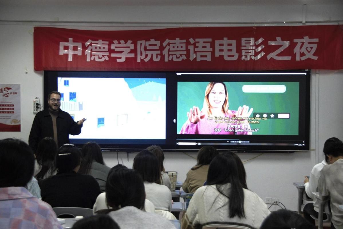第八期电影之夜活动在博学楼727教室举行。本期活动以“新年茶话会”为主题,将德语语言学习、德国文化体验与温馨的新年展望融为一体,为中德学子们打造了一个充满知识与温情的美好夜晚。活动由中德德语老师精心组织带队,并特别邀请德方教师Lutz Legge和Janine Doan共同参与,师生齐聚一堂,在光影、音乐与交流中,提前感受了浓厚的新年氛围,深化了中德文化间的理解与友谊。