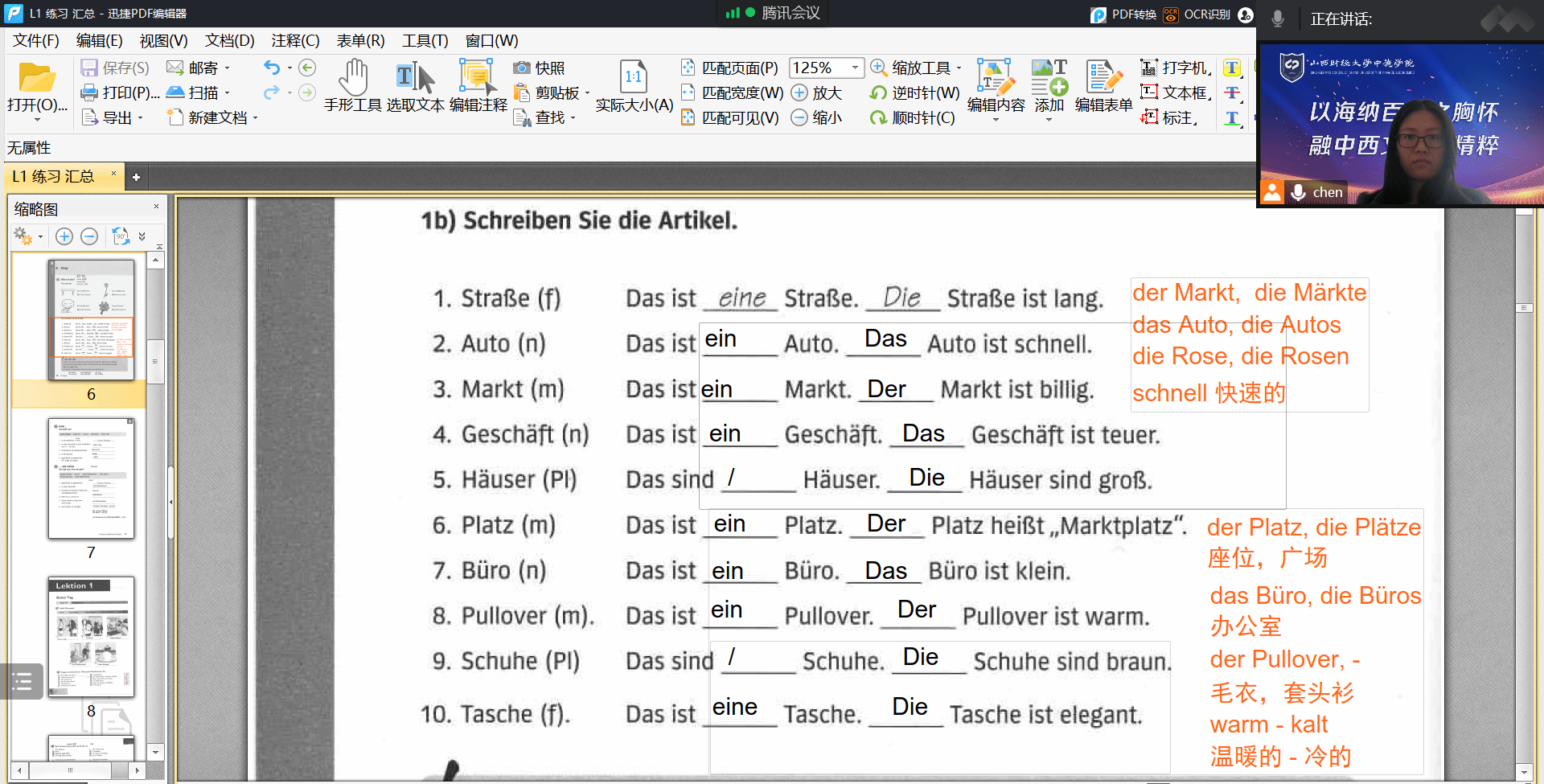 随着课程的深入,同学们已逐渐熟悉线上德语课堂的各项环节。课前同学们会提前调试好设备,准时进入腾讯会议。为了更好地练习发音,在课堂中我要求每位同学都积极发言,采用多种方式,如单人提问、小组对话和集体回答等,来检查同学们的发音情况,以便及时纠正发音。本周教学内容主要以描述教室内物品为主,由例句引入德语冠词第一格的使用方法。