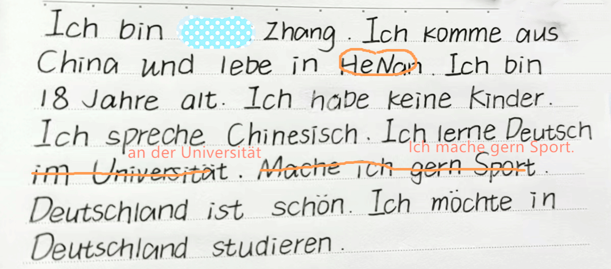 在进行书面表达练习时,初学德语的学生需能够正确地写出自我介绍,并注意正确使用字母的大小写。不论是学生的单词作业,还是句子练习,我都会细致批改,并向学生提出建议,以便学生在收到作业后能够更好地复习。