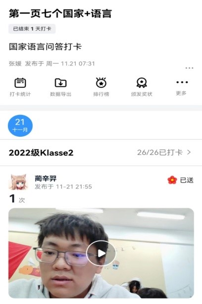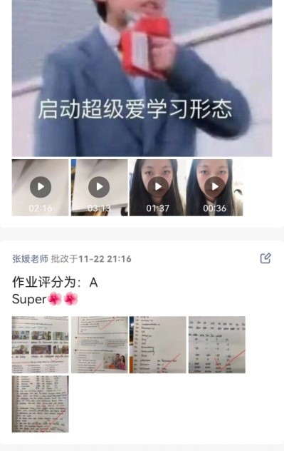 阅读是重要的语言要素,于是我利用钉钉进行阅读打卡,要求学生己每天阅读文章,并摘抄自己喜欢的句子和词语。对于阅读完成较好的学生,我会分享到群里,给予表扬。