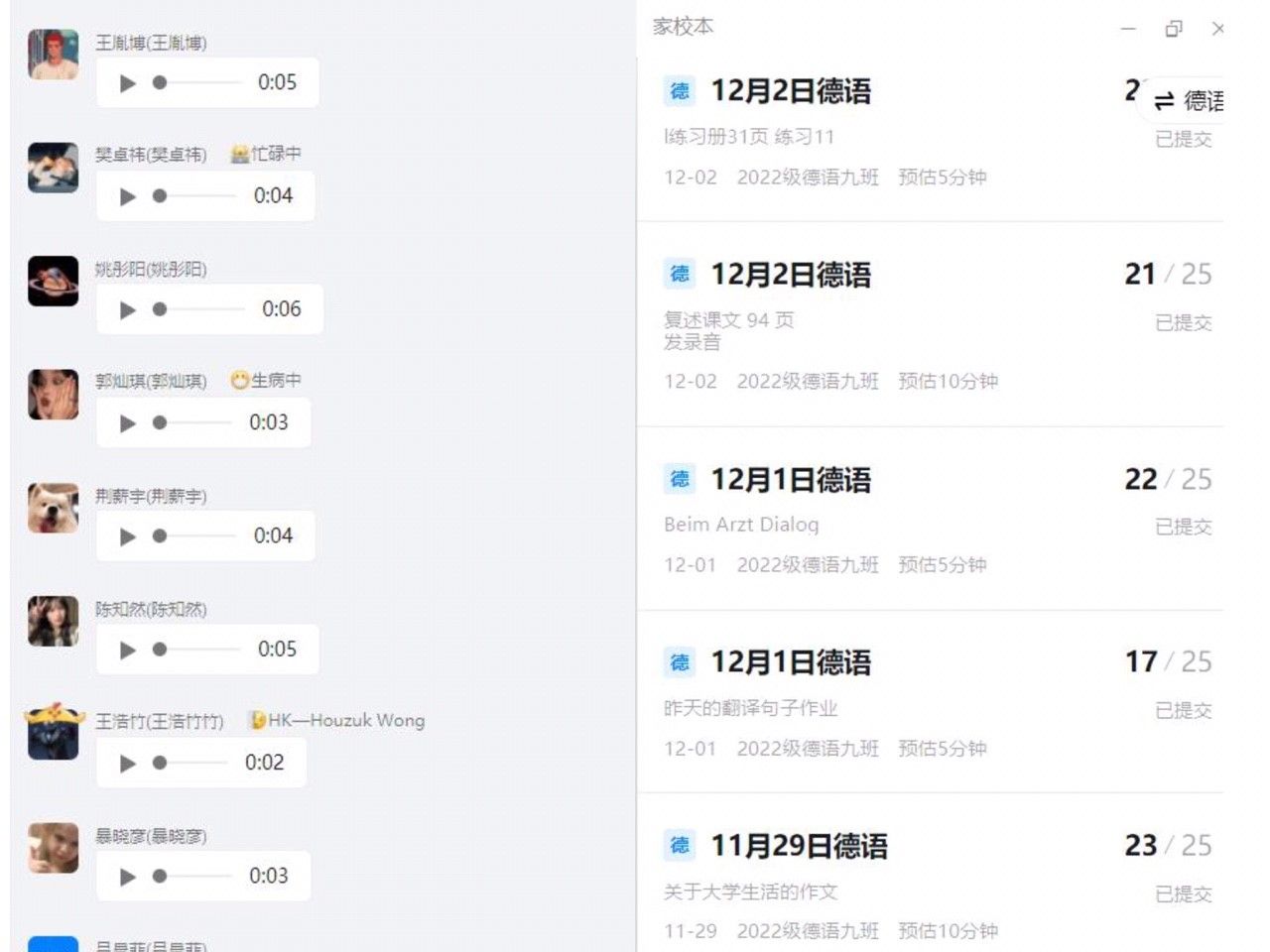 如何让独自在家上课的学生也愿意自觉开口说德语,这可能是多数老师面临的挑战。在讲到重点单词句型时,我会要求所有同学口头造句,并且以语音的方式发送到钉钉班级群,然后当堂逐一点击播放,让所有同学都能听到其他同学的句子。如果有错误,我会马上纠错,让学生再次把正确的句子发送。另外每天我也会布置语音作业,要求学生录对话或者是复述课文到家校本。通过这样课上课下的反复练习纠正,提高大家的口语表达能力。