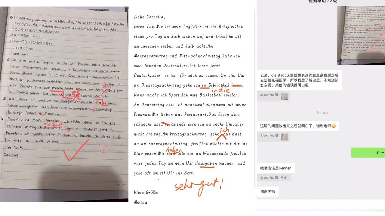 在课上讲解重点单词语法时,除了口头造句外,我也会让学生把自己造的句子写出来发送到钉钉,这样所有同学可以把所有的句子一起查看,发现错误立马改错。另外针对每课的话题我也定期布置写作作业,学生提交,我批阅之后选出优秀作业课堂进行展示,针对某一个意思的不同表达大家也会展开热烈讨论,在这样的过程中大家既提高了德语,也收获了成就感。