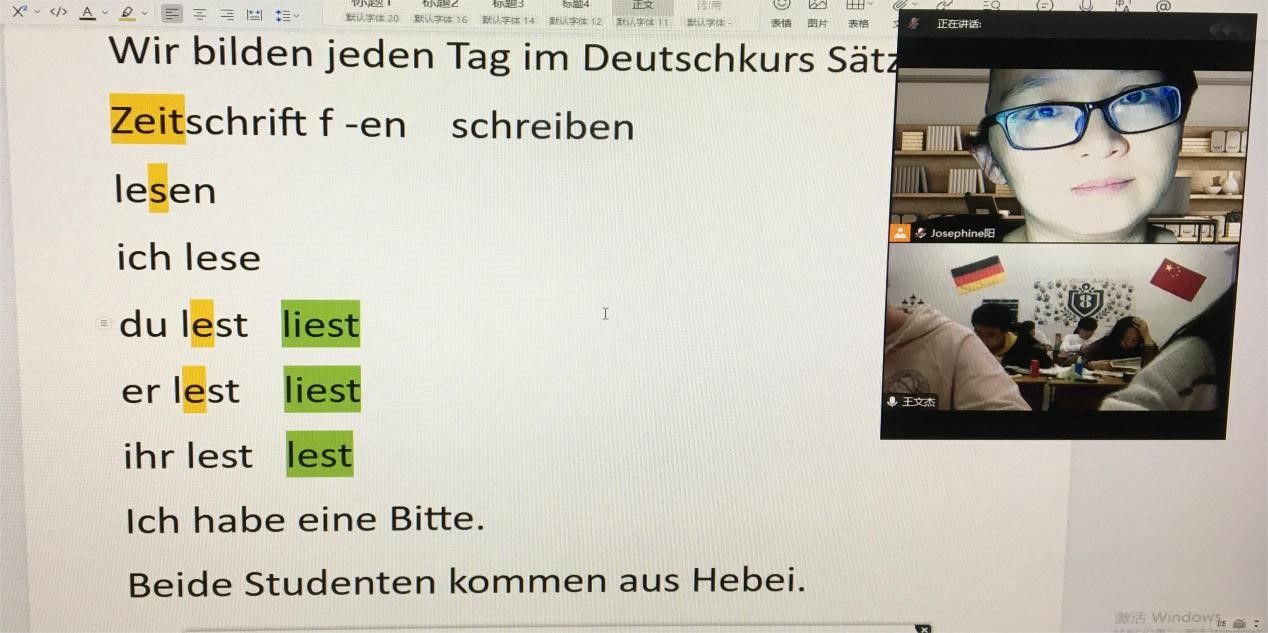爱尔兰诗人叶芝说过:“教育不是灌满一桶水,而是点燃一把火。”只要激发了学生学习内在的积极性,点燃了学生对于德语知识、兴趣的那把“火”,线上教学带来的挑战都可迎刃而解。(德语教研室 李成娥供稿)