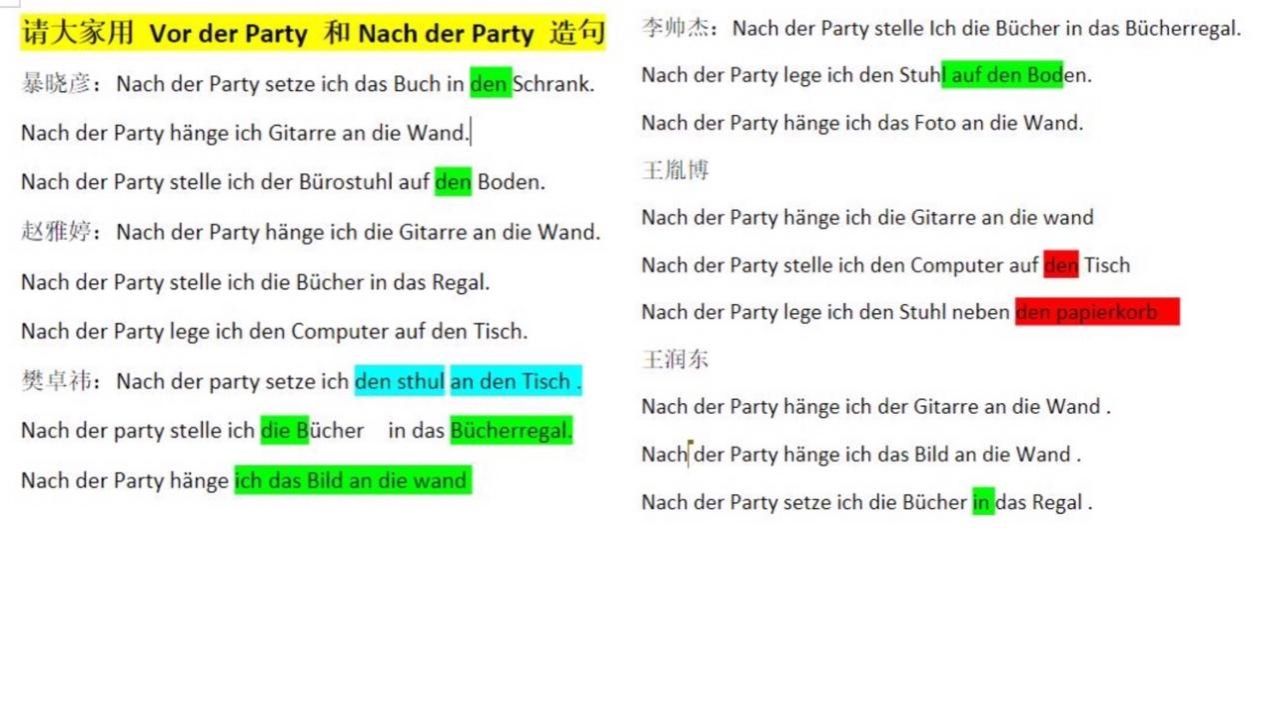 另外,来自大二大三的助教学姐在德语学习上也给了同学们很大的帮助,每天晚自习开始前我都会和助教们说一下今天复习内容的重点,以及哪位同学的发音需要她们帮忙纠正,在她们的监督和协助下,大家学习效率和效果都有了明显的提升。
