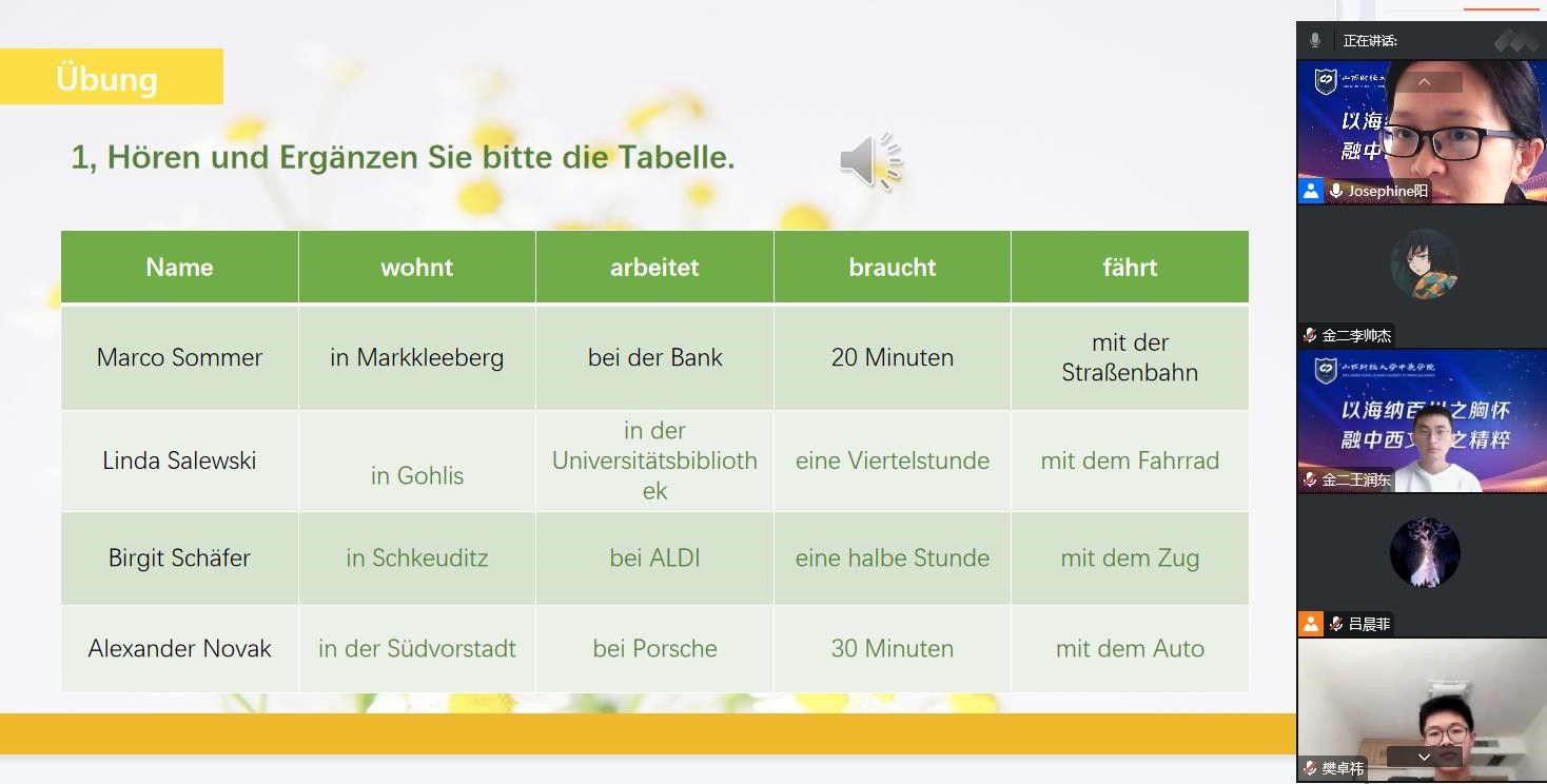 随着多数同学的陆续返乡,我们的线上德语教学也面临新的挑战,如何能让同学们不因返乡而落课,而且返回家之后如何针对全体同学展开德语教学,这是我们全体德语老师面临的新的教学课题。好在疫情以来我们已经积累了不少网上德语授课的经验,结合新的情况,我们也在不断探索和改进新的教学方式。如何从听,说,读,写,练这几个方面着手,取得教学成果的最大化,在这方面我也有了自己的一些新的探索和体会。