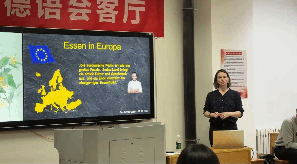 为丰富同学们的课余生活,进一步了解德国的本土文化,12月17日19时,第三期“德语会客厅”活动在博学楼727教室举行,本期主题为舌尖上的德国。德方助教Janika Steiner、Florian Hansen、Julian Leon Neuhaus,各位德语老师和大一年级的同学们参加本次活动。助教Janika Steiner老师主持本次活动。