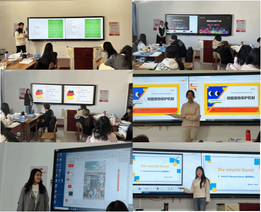 学生报告展示的初衷是提升学生的胆量和表达能力,同时通过涉猎不同的主题,拓宽学生视野,增长见闻。目前共有赵成烨、王艺霏、宋诚婧、王钰涵、李书媛、苗璇等六名学生作报告,主题涉及德国足球、德国柏林电影节、中德文学作品、德国饮食文化、德国宠物保护、游戏解读等,同时结合了主题相关的德语关键词导学,内容丰富、准备充分,集中展现了学生们认真的学习态度和扎实的知识储备。