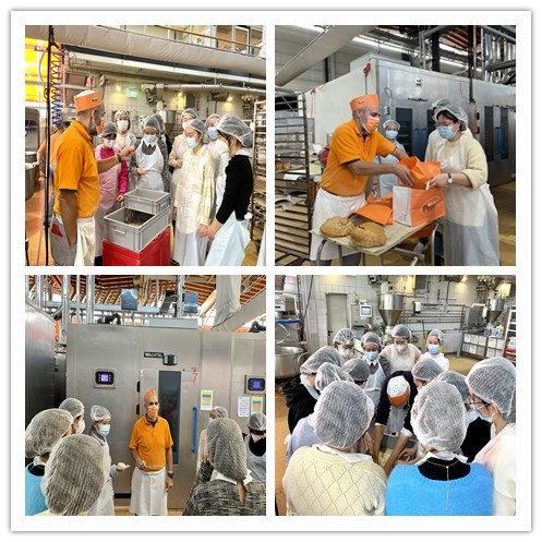 根据德国防疫要求,同学全部做了核酸检测,并经过手部消毒进入面包坊。面包坊师为所有同学分发了头套和围裙,并详细讲解了制作面包的设备、原材料及制作过程,同学们也饶有兴趣地和面包坊师互相交流中德面包文化,师傅们并以唱歌的方式教同学们一起动手参与做自己的面包。