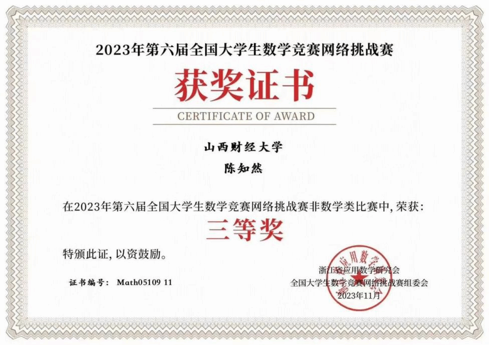 第十五届全国大学生数学竞赛(山西赛区)比赛结果近日揭晓,博雅斗地主下载 2022级金融学专业陈知然同学获得非数学专业组一等奖,同时获得第六届全国大学生数学竞赛网络挑战赛三等奖,实现了博雅斗地主下载 在数学竞赛上零的突破。