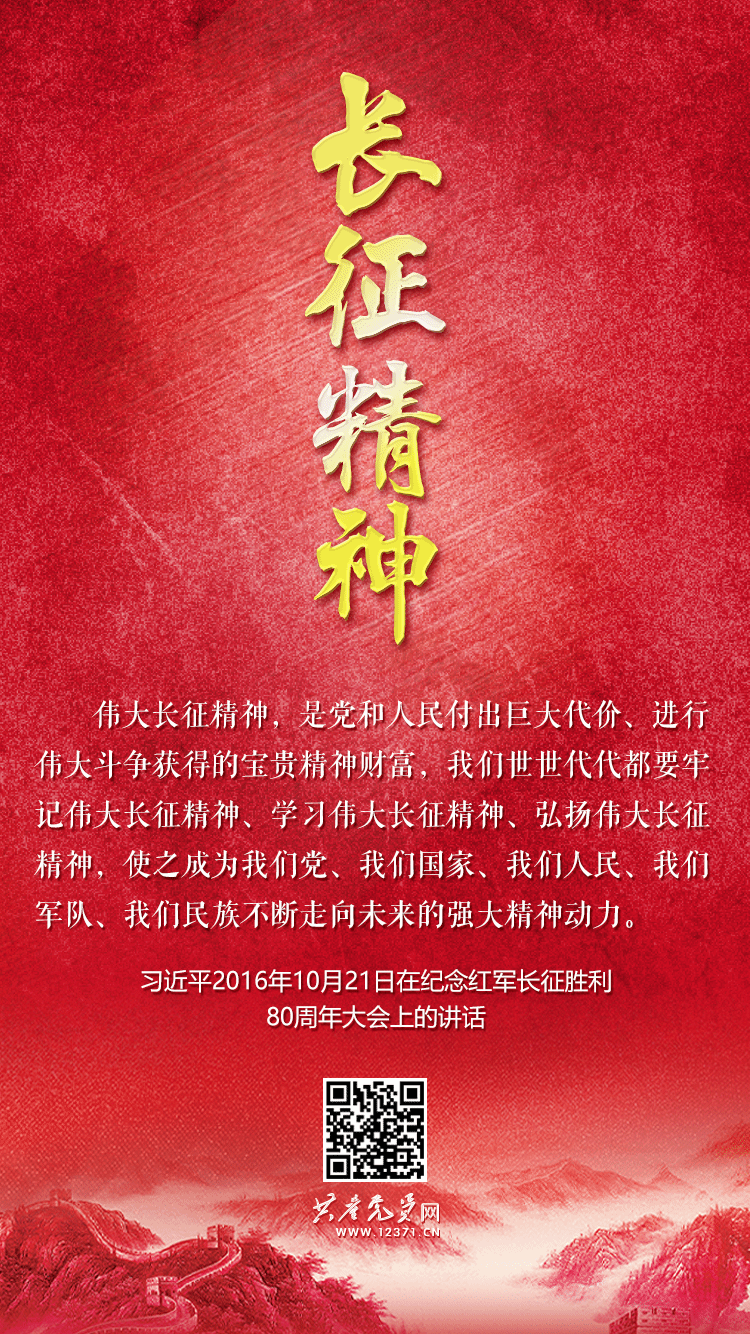 今年是长征出发90周年纪念日,我们回望历史,铭记长征精神。90年前,红军战士们以坚定的信念、顽强的意志,战胜了无数艰难险阻,完成了震惊世界的长征。他们的精神,是永不磨灭的丰碑,激励我们走好新时代的长征路。